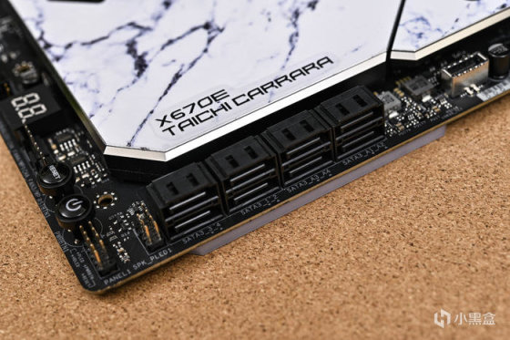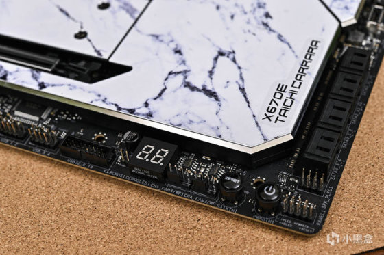 右侧散热片上印有 X670E TAICHI CARRARA Logo,主板右下角有板载电源开关和重启键,旁边还有个Debug LED。