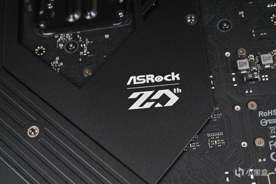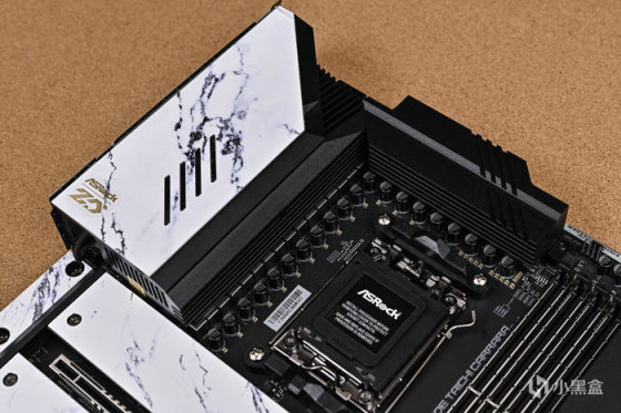 主板供电模块上的大理石纹理,左下角印有 ASRock 20th 金色 Logo,斜纹开孔位置内置一颗小风扇提供主动散热,让供电原件保持低温稳定。