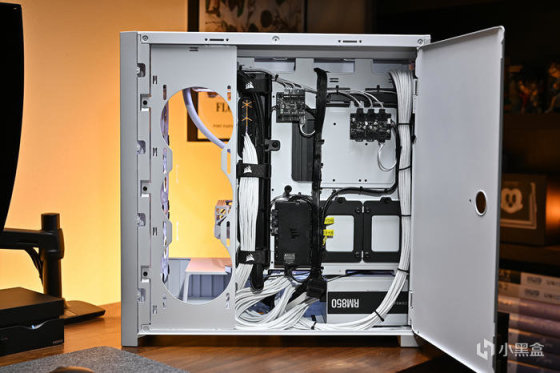 拆除背板玻璃,打开磁吸线材挡板,得益于机箱强大的理线功能,线材虽多,但很容易打理。