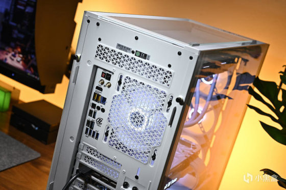 来看机箱尾部,上面左侧是主板IO位,右侧是12风扇安装位,预装一颗 QL120 RGB 风扇。