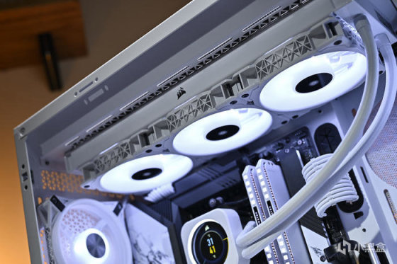 海盗船 H150i ELITE CAPELLIX 冷排上的三颗 ML120 RGB 白色磁悬浮风扇灯效。