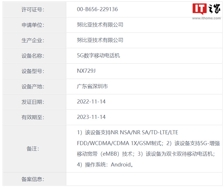 從工信部入網信息來看,該機爲雙卡雙待移動電話機,支持 NR NSA / NR SA / TD-LTE / LTE FDD / WCDMA / CDMA 1X / GSM 制式,還支持 5G-增強移動寬帶(eMBB)技術,搭載 Android 操作系統。