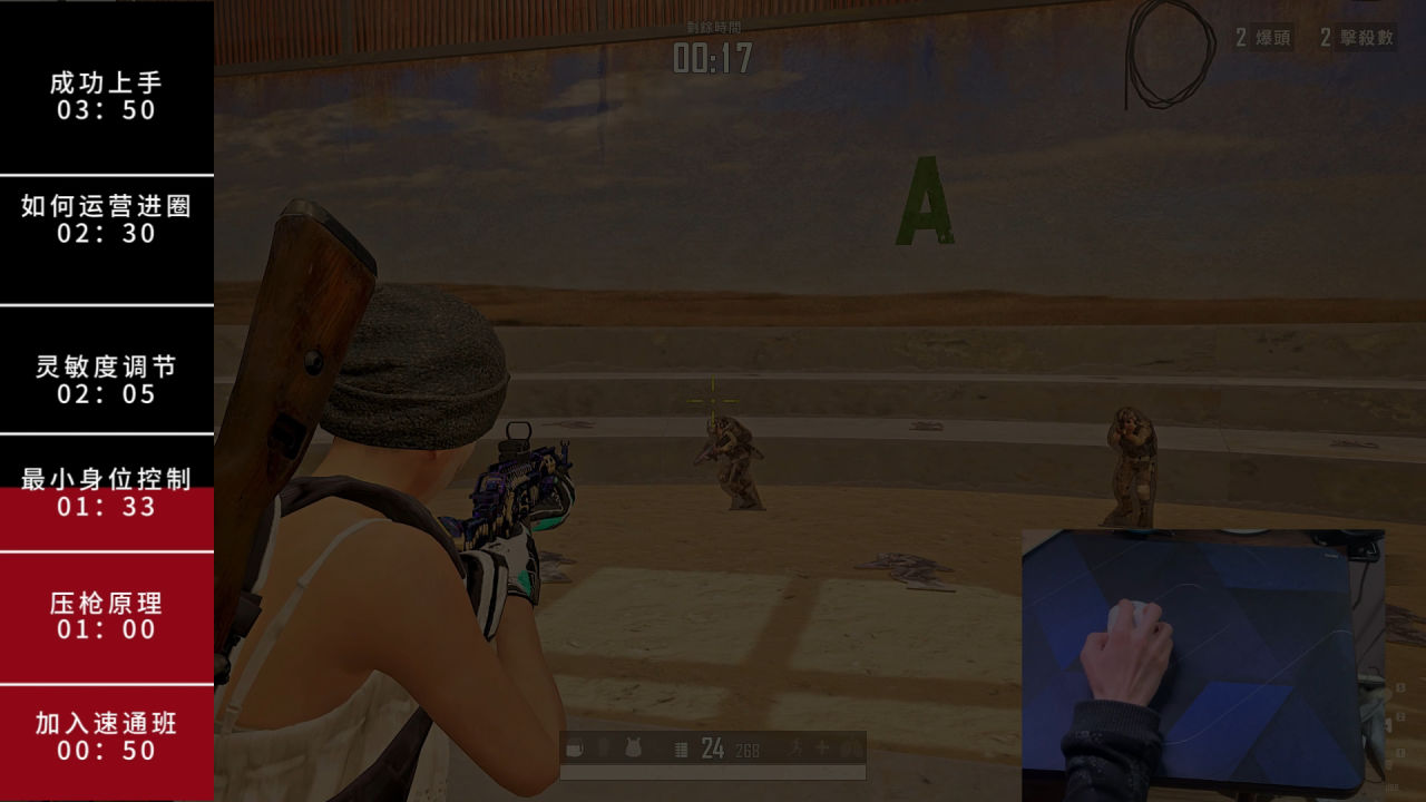 但是有一個問題:如果你看過我的視頻,你只學會了一個技巧。但遊戲技術是槍法、身法、意識等多個方面的綜合體現。你有沒有遇到過這樣的情況:當你學會一個技巧,卻很難在實戰中應用出來?如何系統性地提高自己的遊戲技術呢?不論是槍法、身法還是意識。現在,歡迎你來到——1小時速通PUBG訓練班