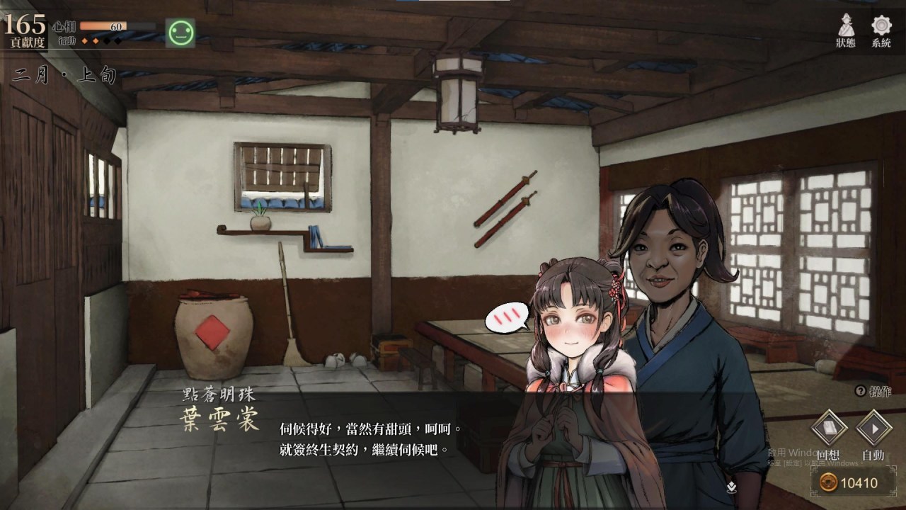 这次玩的是普通难度,整体玩起来很忙,要做的事情很多,一边要在时限内达到一定的能力或好感要求,另一边又不能完全放弃提升武功不然敌人会打不赢,真的必须做到每一步都十分准确
