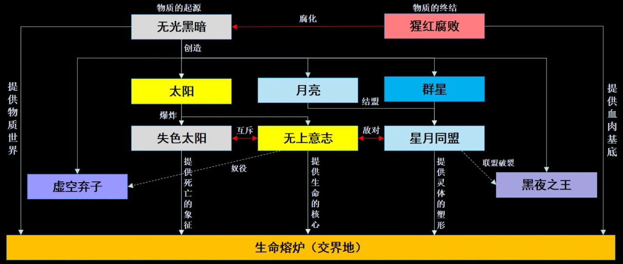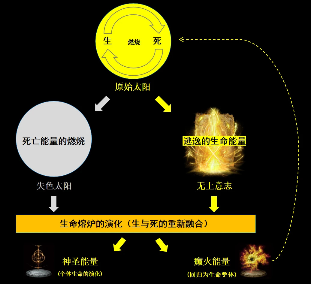 當然,以上太陽爆炸理論全部只是我個人的猜想,讀者您若有不同意見,不必照單全收。但此理論不僅可以說通生與死、光與暗之間的聯繫、解釋無上意志的起源,甚至能爲後面才登場的癲火能量的起源提供理論支撐(原始太陽),我覺得還是相當有信服力的。在之後的章節中,我也會再次提及這個推論。