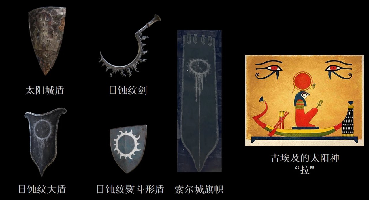 失色太陽的圖案主要出現在太陽城、索爾城以及靈廟士兵的相關道具中,往往與死亡相關的信仰共同出現。這種聯繫並非遊戲的原創,其明顯取材於埃及神話——古埃及人相信“太陽的東昇西落代表靈魂的生死輪迴”。