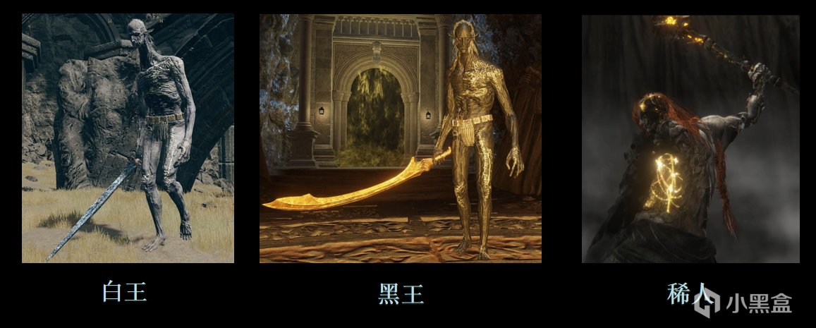 黑白王擁有岩石般的皮膚,壽命極長。從名字上看,他們可能就是由交界地本土沒有的物質構成,即“縞瑪瑙”和“雪花石膏”。而從形態上看,人形的外表可能也在暗示它們同樣都是基於生命熔爐演化出來的產物,只是其物質基底並非熔爐本身,而是異星隕石。