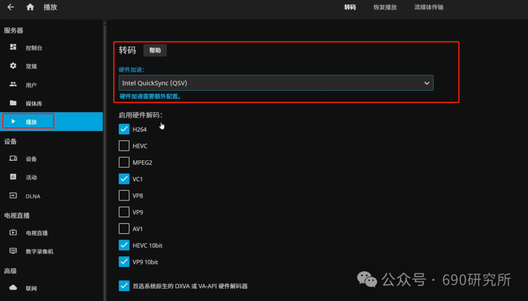 下面格式除了AV1都打上勾,N5095和N5105的CPU要注意,得把这里低电压模式打开,允许HEVC格式编码打开,启用色调映射打开,最下面保存,到这里就基本可以正常转码电影了