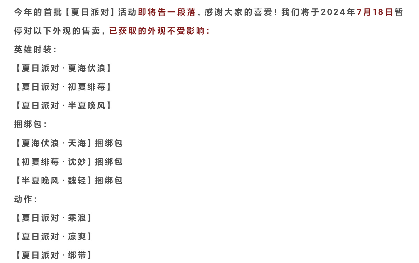 最後重點來了,由於一些玩家對新出的這幾款夏日皮膚非常的不喜歡,甚至有一些說什麼太過露骨或者什麼其他的總之,官方表示將會在7月18號暫停對這幾款泳裝皮膚的售賣