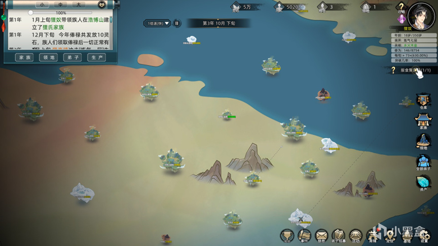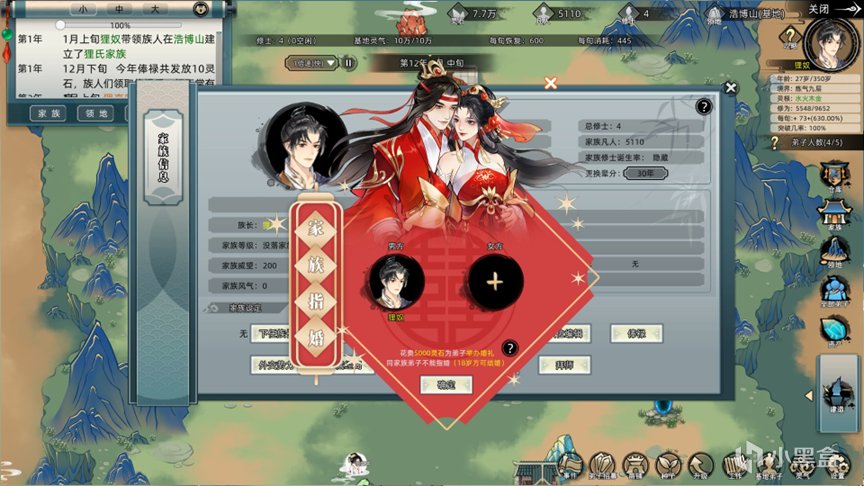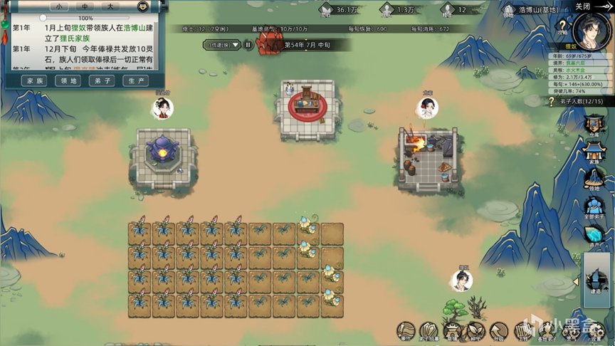 你要管理的是一个家族,从一两个人丁慢慢发展,分配他们去进行建造灵田、炼丹、采集材料等工作。人物关系很丰富,父母、道侣、弟子、师尊、家族、好友等等,这样才是一个家族嘛。在左侧也能看到他们的活动信息。