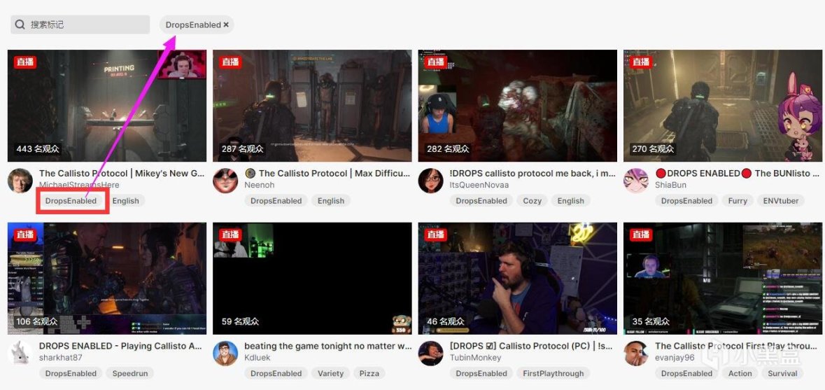 - 點擊該標記,可以搜索該遊戲直播分區內所有已開啓Drop的主播