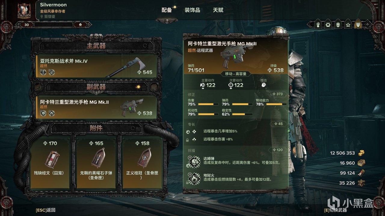 枪我选择了重型激光手枪,由于带了炽热虔诚所以给他搞了个地狱火,处理纳垢兽会舒服一点。各位可以自行选择自己喜欢的枪。