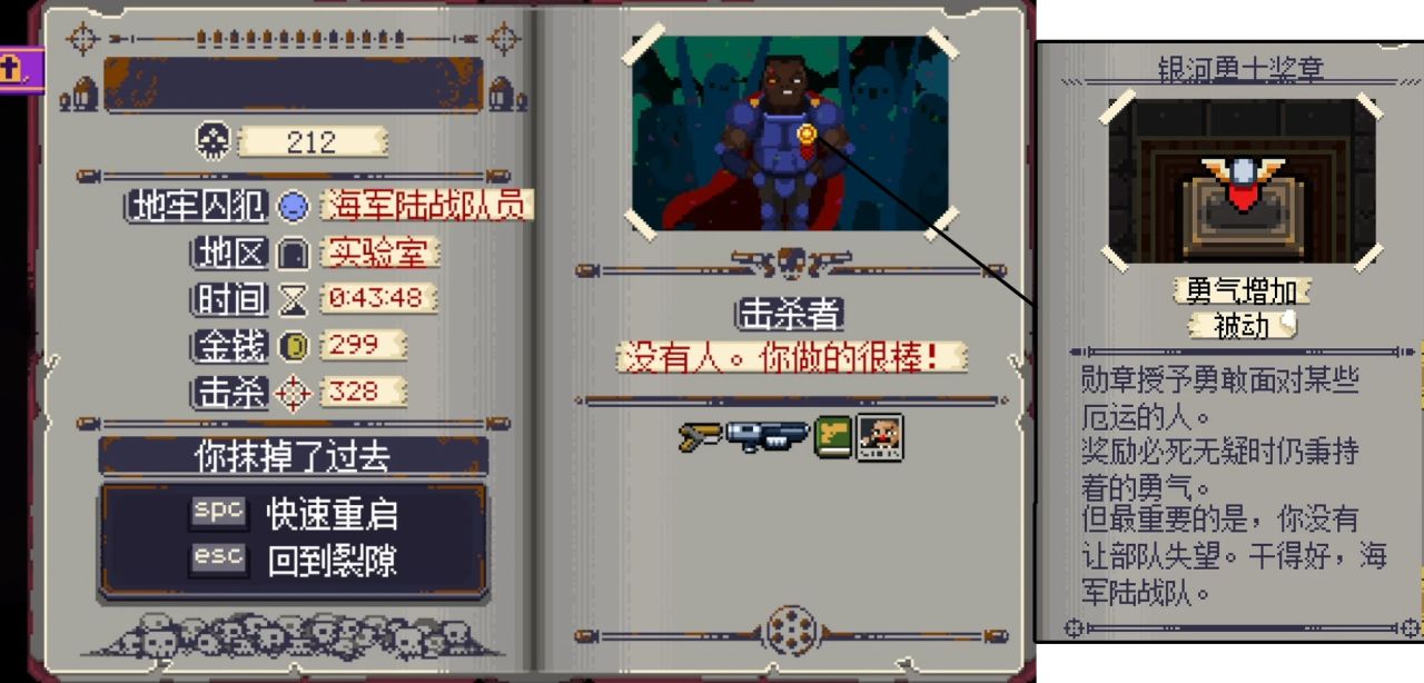 最终,海军陆战队员,在队友们的簇拥下,获得了“银河勇士奖章”(大幅度提升换弹速度,并对Boss特攻伤害,而且减小子弹偏移,提高精准度)。