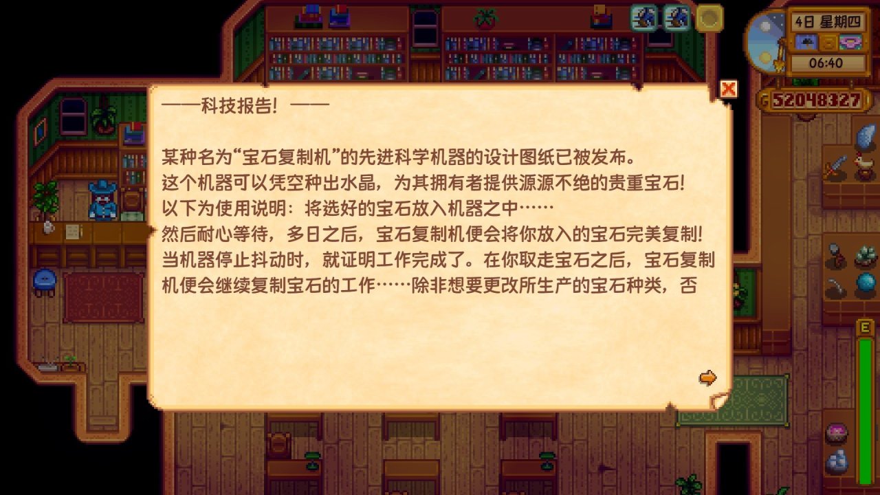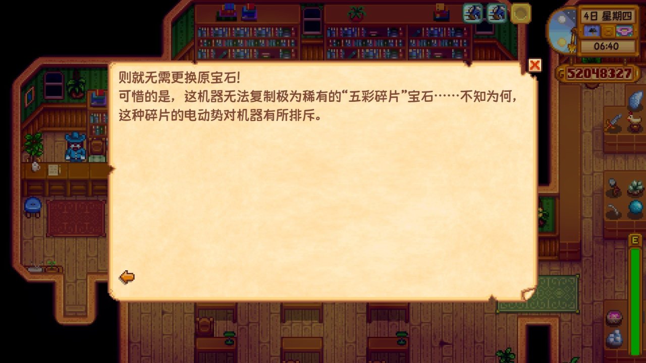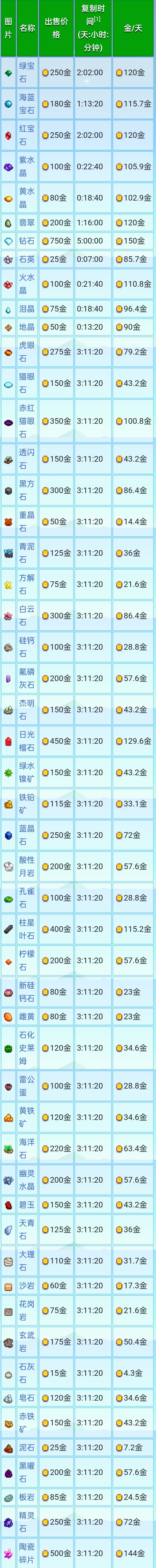 簡單點來說就是,你可以往寶石複製機裏面放入你想得到的寶石或礦石,等待幾天後就會產出該物品,並且你只需要放入一個寶石或礦石就行,之後會源源不斷的產出,如果你想更換,就用十字鎬把寶石複製機敲掉,這樣原料和寶石複製機就都會掉落出來,然後你再把寶石複製機放好,接着放入你想複製的寶石或礦石就行,寶石複製機具體可複製的物品與複製時間如下圖所示,注意,複製時間只是一個大概,並不完全準確,但是隻會少不會多(因爲遊戲中早上6.—凌晨2.的時間流速和凌晨2.—早上6.不同,從早上 6 點—凌晨 2 點期間,1 小時 = 60 分鐘,但從凌晨 2 點—早上 6 點期間,1 小時 = 100 分鐘。一整天爲 1600 分鐘,其中白天爲 1200 分鐘,夜晚爲 400 分鐘)