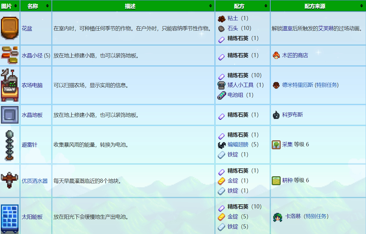 所有需要用到精煉石英作爲材料的製作物品