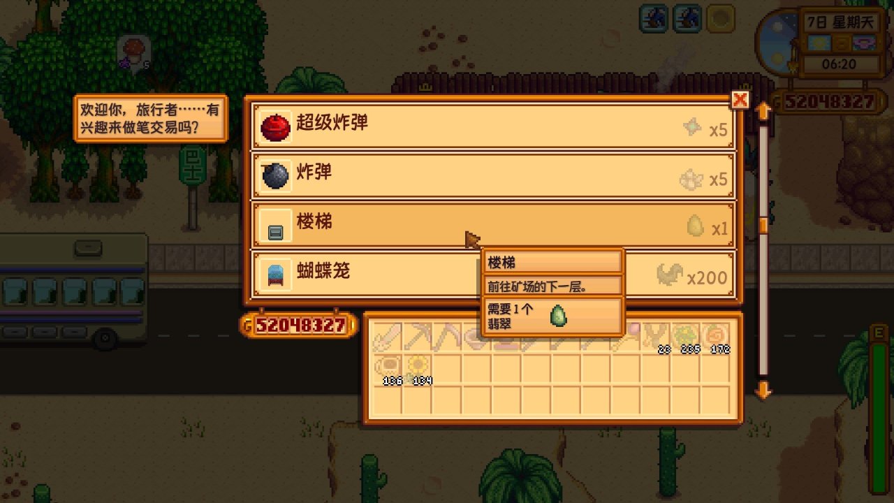 樓梯對於追求極限炸礦的人來說是必備的,很多人炸礦都是先用樓梯搭下深層,再開始炸,或者看到這層沒什麼礦時,就直接用樓梯搭到下一層,包括碰到怪物層的時候也用樓梯搭到下一層,避免浪費時間,而且在後期做齊先生核桃房的個別任務時,樓梯也有妙用,但樓梯的製作材料爲99個石頭,需求量高,並且一用就沒了,如果你到羅賓商店買石頭,第一年時,一個樓梯的成本是1980金,第二年開始,一個樓梯的成本爲9900金,十分貴,但沙漠商人在週日時會出售樓梯,一個翡翠換一個樓梯,這時複製翡翠就顯得十分有價值了,可以省很多錢,翡翠的複製時間爲1天16小時,我這裏不追求極限炸礦,對於只用樓梯過一些無礦層或怪物層,以及後期接到齊先生核桃房個別任務時使用樓梯完成的玩家來說,大概20個寶石複製機就足夠了,一週能收個4次左右,就是每週能收80個翡翠,在週日時去沙漠商人那就能換80個樓梯,在下礦時應付一些無礦層、怪物層等夠用還有剩,能存不少,到後期開啓齊先生核桃房後,做裏面的那些任務也夠用