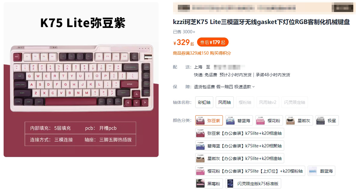 一到二百價位可以看看珂芝K75lite,手感方面沒的說,179元這個價位還給了彩虹軸、PBT鍵帽和五層填充,還是三模無線鍵盤,配置絕對是很卷的。