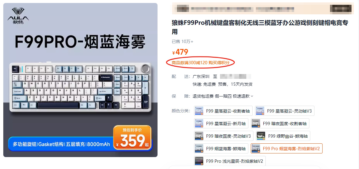 三百價位狼蛛F99PRO,8000毫安的大電池絕對是續航黨的福音,素質出色的烈焰紫V2軸體手感也是很不錯,2U0大鍵位+旋鈕的配置也能滿足一些朋友的使用習慣,推薦買菸藍海霧版,側刻版稍微有點醜。