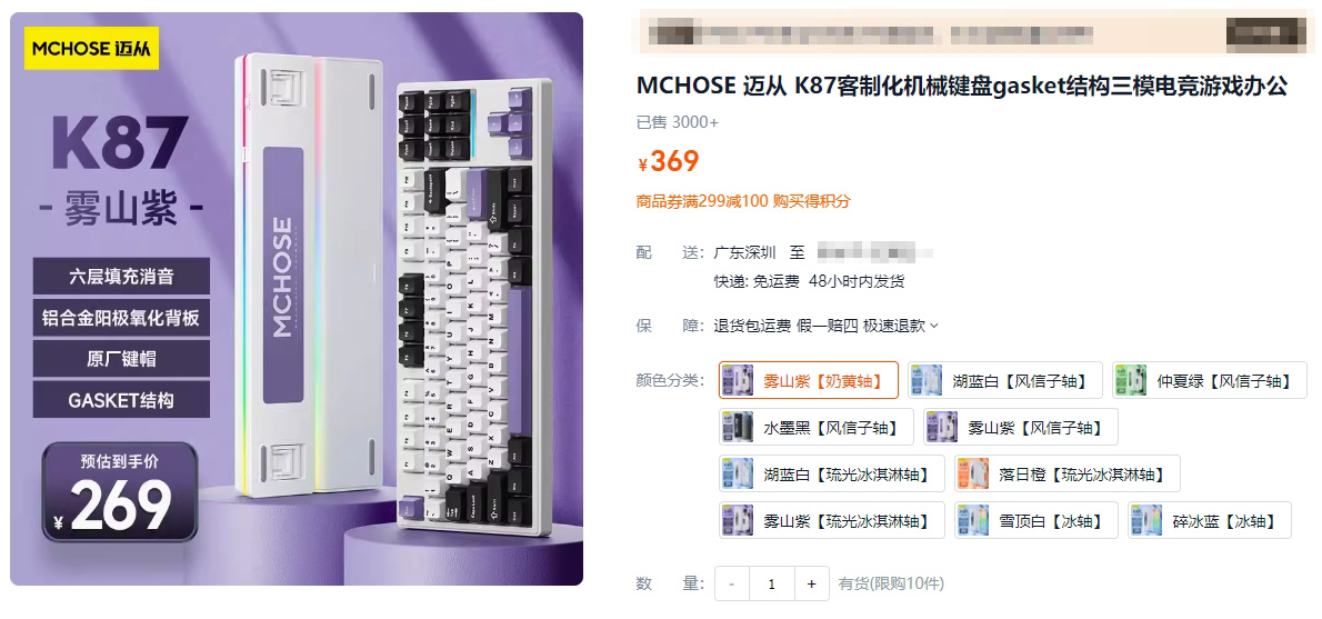 二百到三百這個價位肯定要要看看邁從K87,這個產品前端時間的熱度大家也是有目共睹的,客製化濃郁的設計,Gasket結構+六層填充,甚至還給了個燈帶,這種程度真的沒什麼可說的了,269元起的價格也可以說是誠意滿滿。