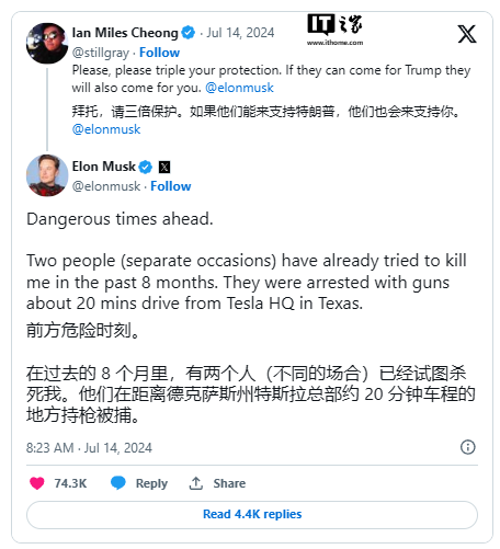 IT之家注意到,上個月在特斯拉的年度股東大會上,當被一位股東問及如何確保他的安全以及作爲高調人物如何照顧自己時,馬斯克也提到了這一情況。他回應稱,他理解股東的關心,並再次強調了當前形勢的嚴峻性。