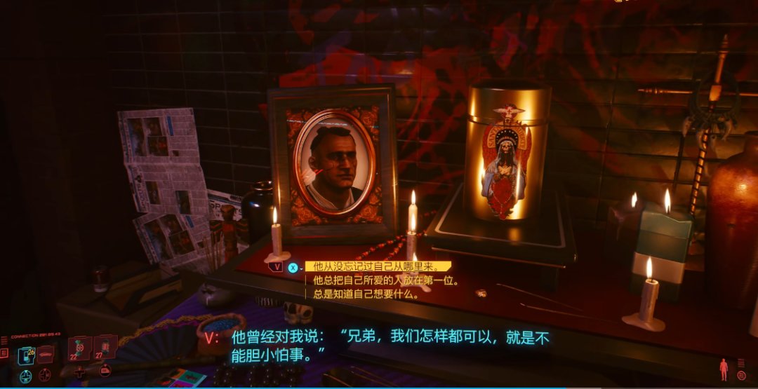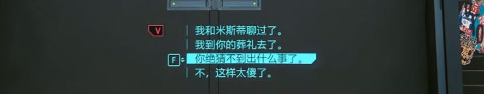 如果要总结的话,“仪式感”是构成这一任务的关键词,玩家会去探访杰克的车库,并选择一件遗物用来参加追悼会,同时还要作为代表进行发言。从任务发生的时间看,这一支线也算是主角V和过去的自己告别。