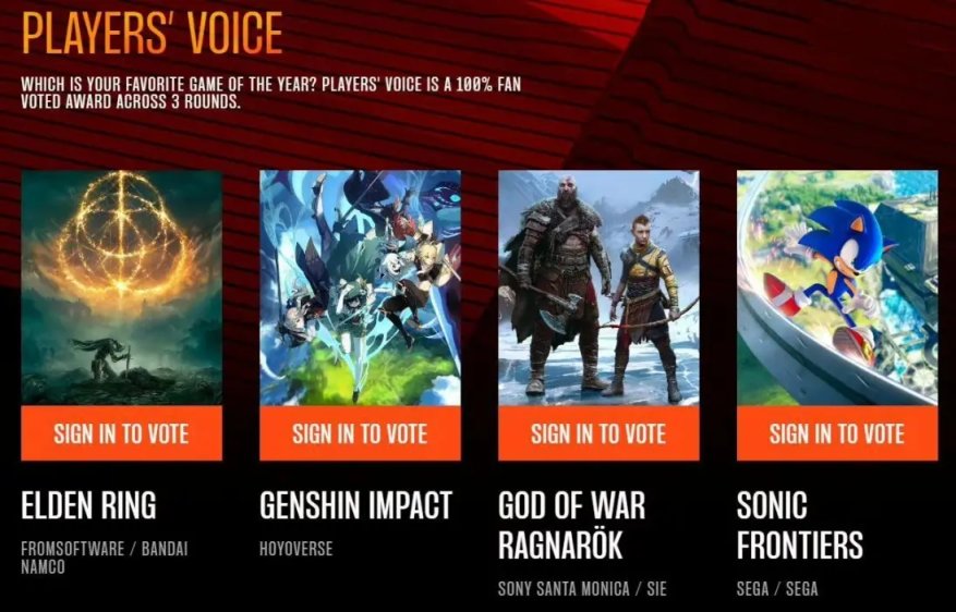TGA玩家之聲第三輪原神反超索尼克成爲第一