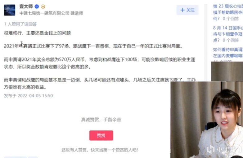 然後是某乎上,有人說組織申真諝和戰鷹二段下一百番棋,搞升降制。結果被下面老哥回答弄破防,“2021年申真諝正式比賽下了97場,跟戰鷹下一百番棋,相當於自己一年的正式比賽對局量,而申真諝2021年獎金總額爲570萬人民幣,考慮到和戰鷹連下100場,可能會影響後續的職業生涯狀態,所以獎金數額肯定要比這個數高的多。”