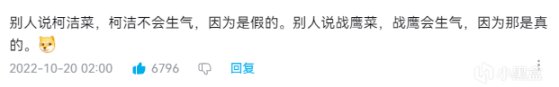 戰鷹再回應王天一,說自己不是邊緣棋手(事實可能真的算是),然後戰鷹Cue到柯潔,說她在圍棋頂級聯賽圍甲下棋,雖然戰績很差,但也算“核心棋手”,並且柯潔離她家只有5公里。這句話倒也沒錯,可以理解爲在LPL打比賽的職業棋手。
