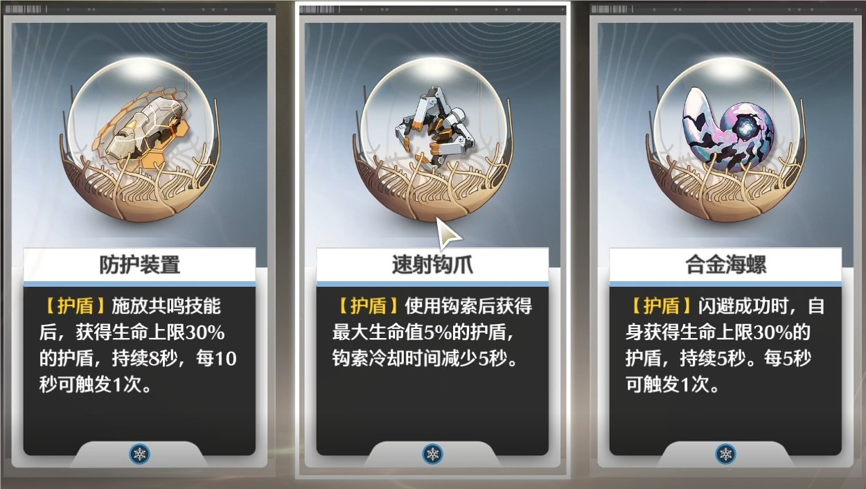 ②【速射鉤爪】讓你鉤索再-5秒,而且這個技能是隻要鉤索亮了就能用,無限給盾,觸發龜龜聲骸減CD。