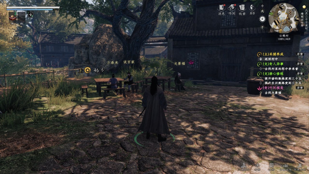 在地图大概(1089.1469)的位置,你会发现有两个人在下棋,我们到他们旁边,会自动进入过场CG