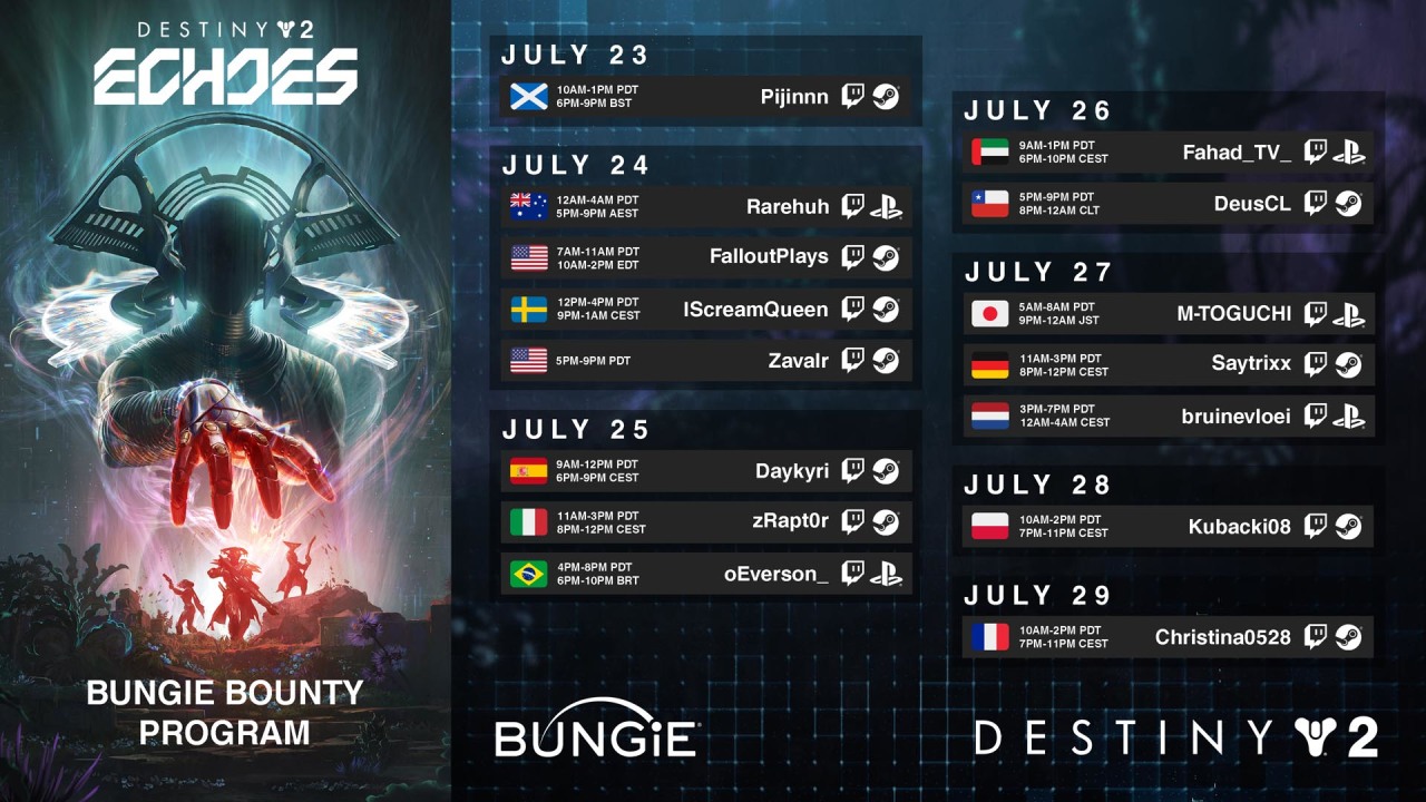 1. 北京时间7月26日凌晨1点,Bungie Foundation直播之前的七柱混战PVP锦标赛的半决赛和决赛。