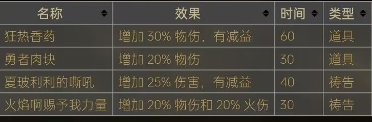 包括各種肝臟,肉塊,藥丸,這類buff主要是作爲過渡應急或者某些特攻手段使用,本身的獲取不如禱告靈藥這種方便(需要對應配方或者盧恩囤貨),後期可以搭配試一試,但效果不如對應的禱告,倉鼠玩家一般屯着不會用,猴戲的常客
