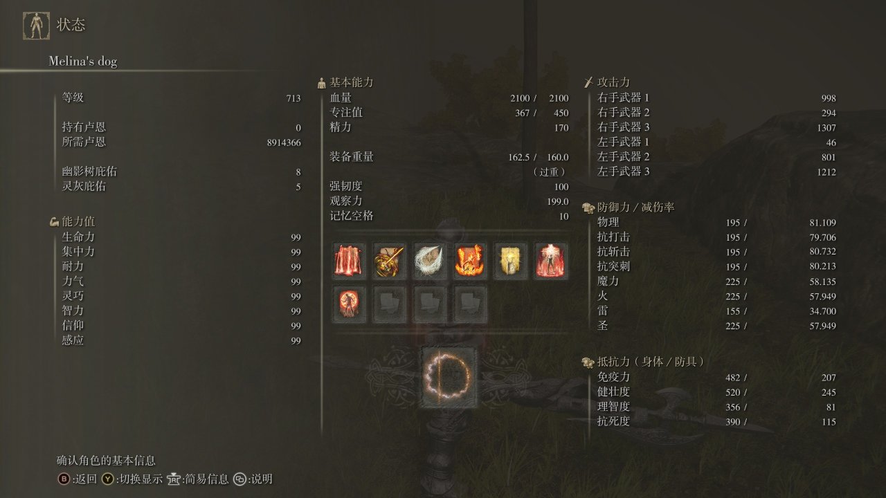 dlc中的銅綠護符負重越重,減傷率越多,當疊加到過重時減傷率達到最大,法師可以配合魔法之境,戰士配合聖域。但是侷限性也很大,相當於犧牲了靈活換來了硬度,出血跳劈,近戰翻滾流派的可以跳過,首推和踢技術吸血流搭配。