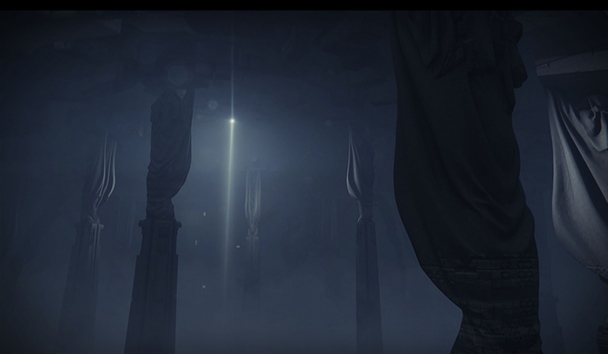 守护者们进入了一个呈九宫格分布的封闭场地,颜色单一的壁画,连通的房间,倒转的阶梯,仿佛进入了墓室。当所有人都在中间的房间讨论刻有“给予”图案的共振箱时,四面八方的门同时关闭,也预示着第一场遭遇战的到来。