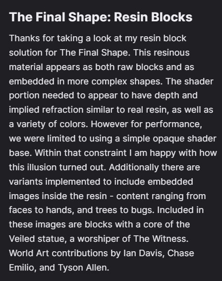 这段话简述了他们对于“树脂方块”的设计,它以原始的复杂形状展现,着色器简单却能呈现深度的折射效果