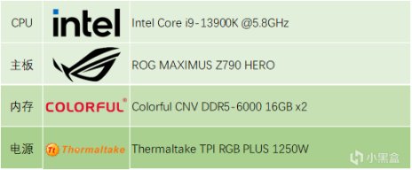同时测试平台还包括Core i9-13900K,ROG MAXIMUS Z790 HERO,Colorful CNV DDR5-6000 16GB x2,Thermaltake TPI RGB PLUS 1250W
