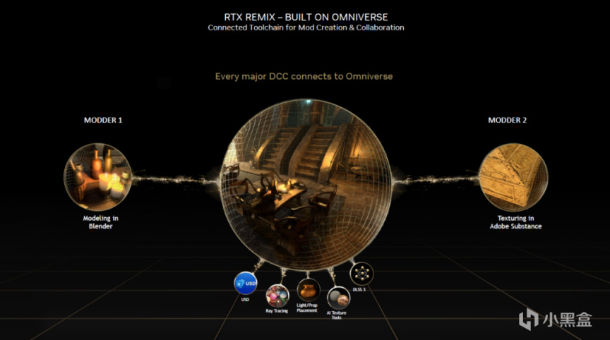 这时候就轮到NVIDIA RTX Remix登场的时候了。RTX Remix通过NVIDIA Studio整合AI纹理工具、光线追踪、DLSS 3以及Omniverse平台协作,可以在短时间对《传送门》场景中的纹理、几何结构、光照情况进行捕捉,并自动抓取素材自动连接到USD通用场景素材包中。