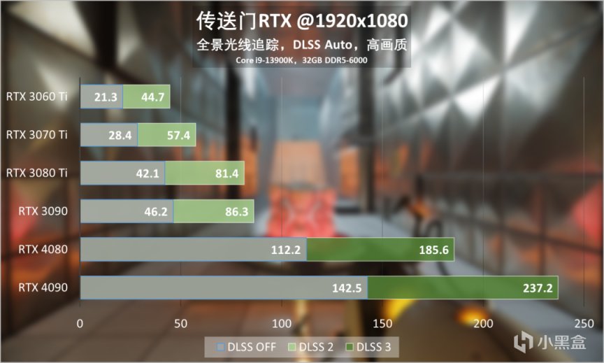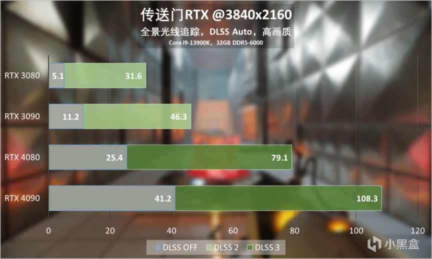 在4K分辨率下,全景光线追踪效果,DLSS Auto模式下,可以看到GeForce RTX 4090的帧率可以轻松破百,相比关闭DLSS 3提升了2.5倍以上,同样GeForce RTX 3090和GeForce RTX 3080由于RT Core的性能限制,以及仅能开启DLSS 2,帧率只能维持在30FPS上下,属于勉强能玩,如果关闭DLSS 2,个位数帧率就完全不用想了。