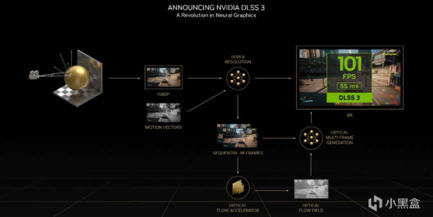 与GeForce RTX 40系列同步推出的DLSS 3更是往前跨了一大步,它不再是简单的依赖于RTX GPU中的Tensor Core实现,而是代表了一整套AI解决方案的集合,不仅能让画面获得更为自然的光影交错效果,还能脱离GPU自行重建高分辨率画面,GPU只需要原画质1/8的渲染运算,就能实现原画质的效果。这也成为了GeForce RTX 40系列游戏帧率大幅提升的原因。