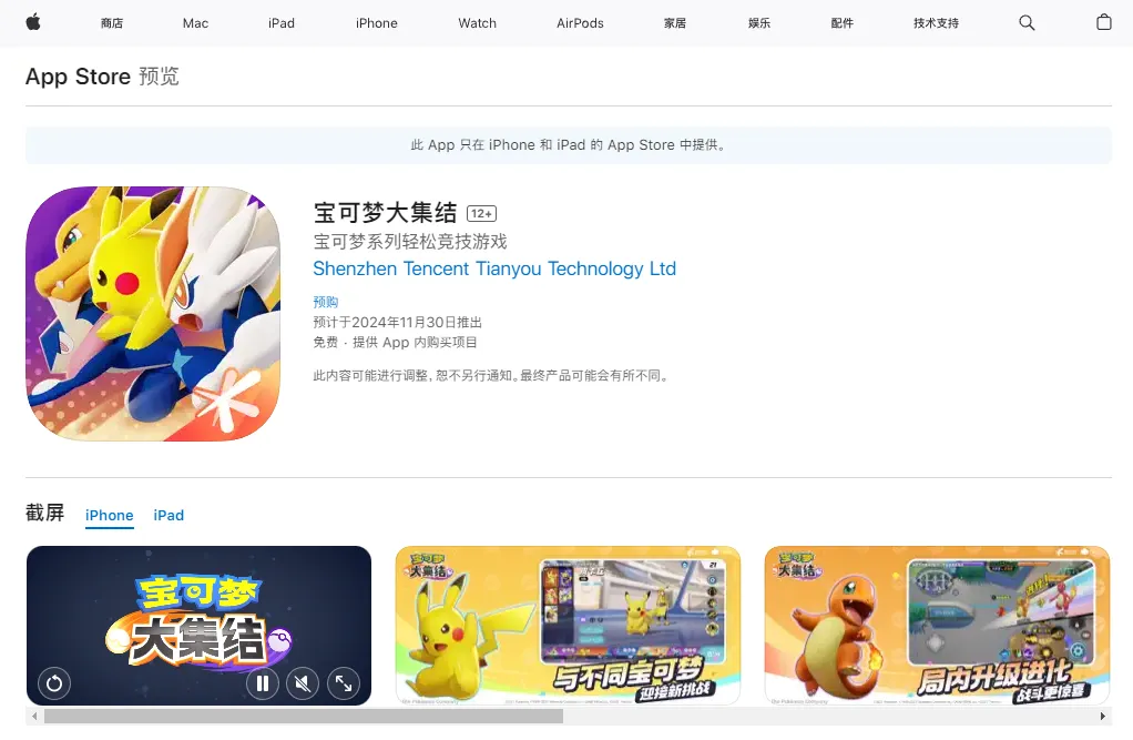此外,iOS國區官網顯示,國行版《寶可夢大集結》預計11月30日推出。(不排除是佔位符)