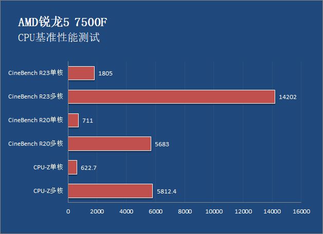 在Cinebench R23的測試中,AMD銳龍5 7500F的單核心分數爲1805pts,多核心分數爲14202pts。在Cinebench R20的測試中,AMD銳龍5 7500F的單核心分數爲711cb,多核心分數爲5683cb。在CPU-Z自帶的性能測試中,該處理器的單核心分數爲622.7分,多核心分數爲5812.4分。由此可見,AMD銳龍5 7500F的多線程性能優勢還是非常明顯的,可以在運行大型軟件或多個程序時帶來數倍的效率提升。