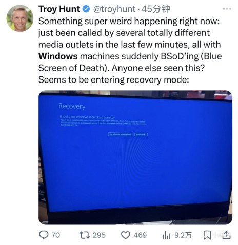 随后,在全球范围内,许多微软用户反映称搭载Windows系统的公司电脑出现了“蓝屏”故障,无法正常启动。