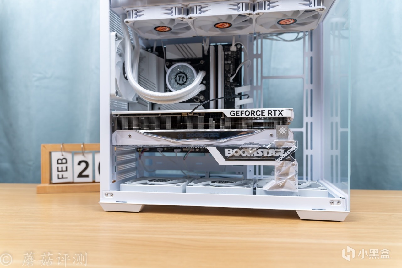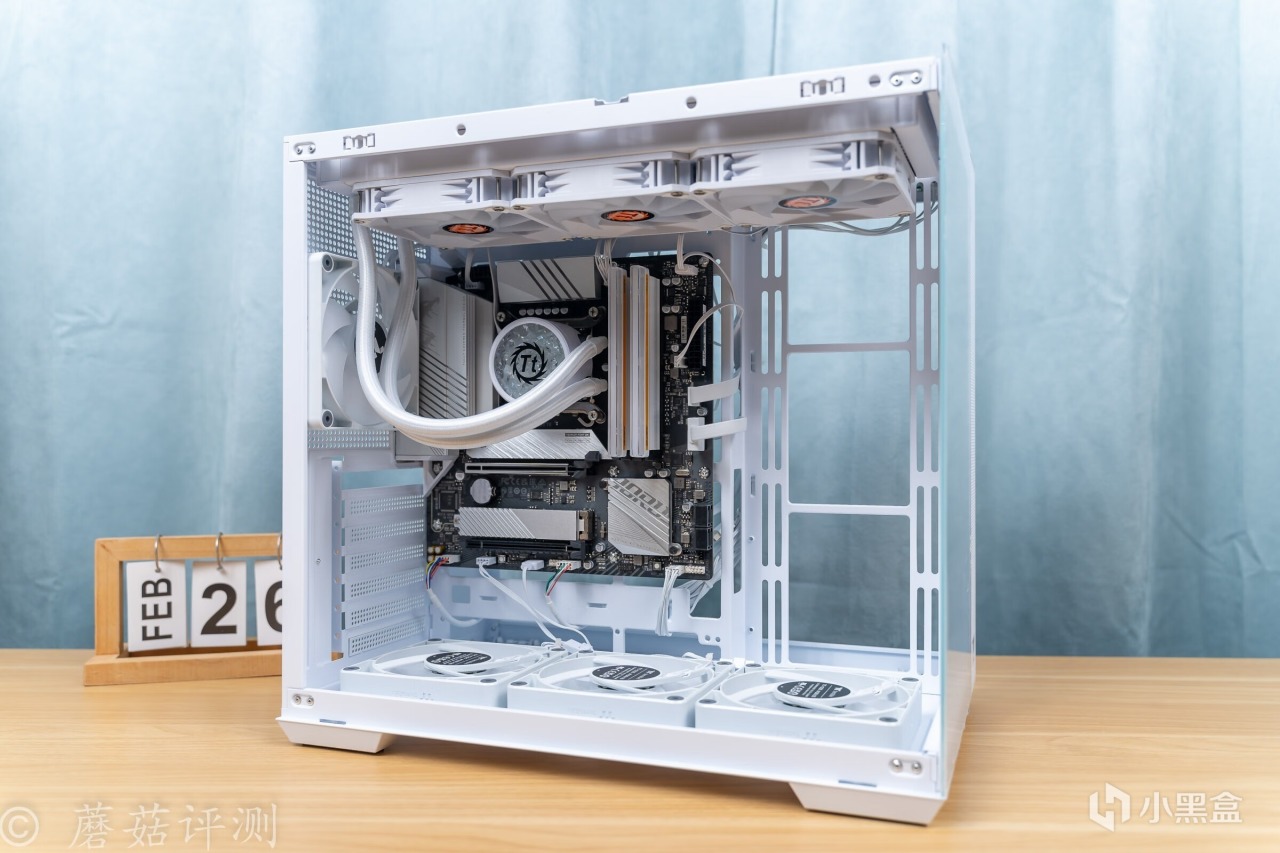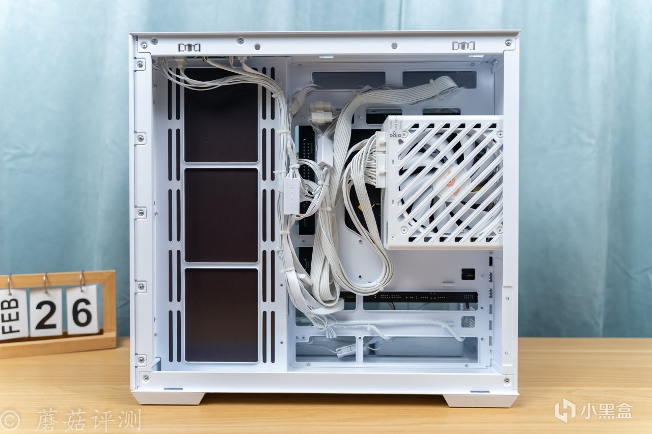 ▼海景房机箱,侧面和前部都是侧透玻璃,主板的旁边还要安装一块磁吸装饰板,那只能从机箱底部进风了,保证机箱内部的散热,因此在机箱底部安装了三把机箱风扇。
