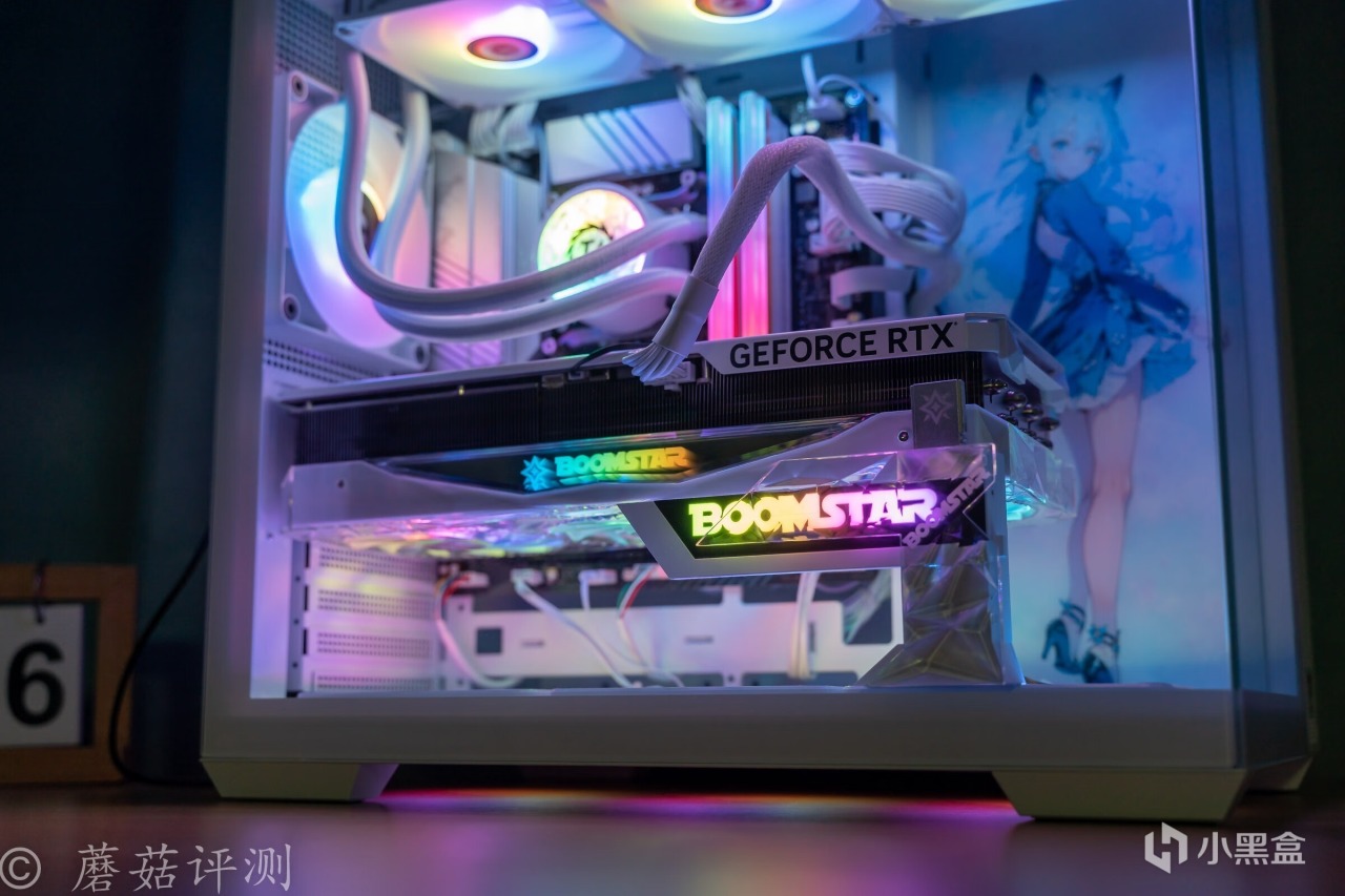 ▼影驰这张RTX4080 Super星曜OC显卡,显卡和标配的显卡支架,均支持ARGB灯效,支持主板同步,可以和机箱内部的其他硬件同色,效果就很不错。
