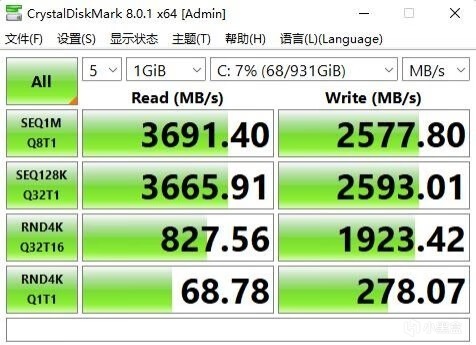 ▼简单跑个读写测试,固态顺序读取3691MB/s、写入速度2577MB/s,4K读取68MB/s、写入278MB/s,不错不错,当个系统盘很优秀了。