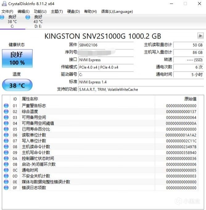 ▼固态硬盘方面,金士顿这块通电次数进6次,全新无疑。接口稳定在PCIe 4.0 x 4,支持NVMe1.4。