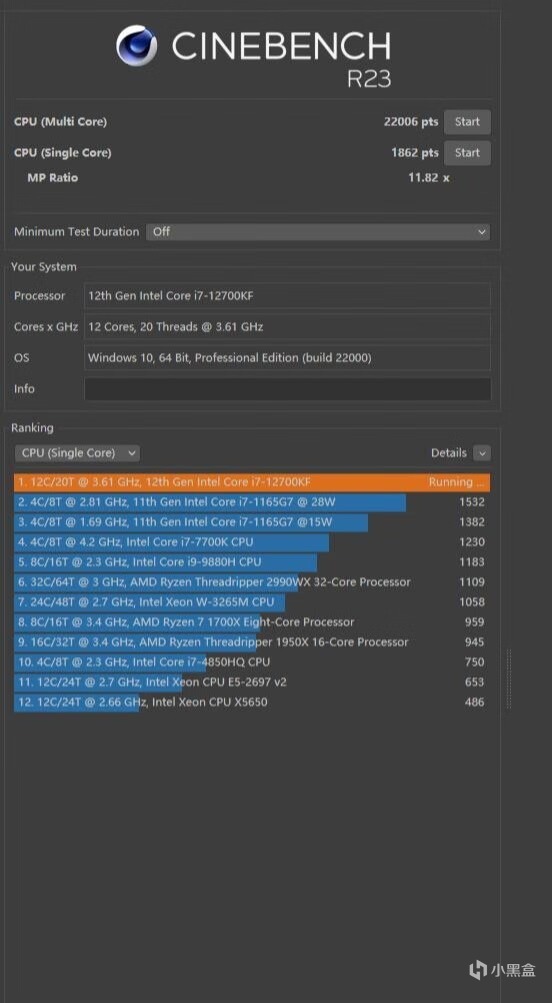 ▼跑个CineBench R23,单线程得分1862,多线程得分22006,不错不错。
