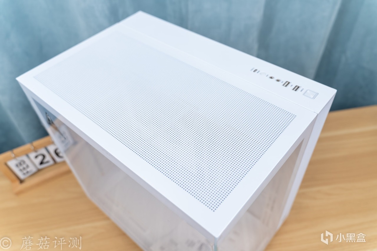 ▼机箱顶部,是一整块的金属顶板,左侧是超大面积的金属冲孔网。