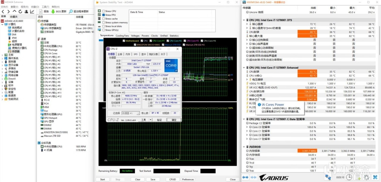 ▼简单跑个CPU-Z的压力测试,处理器功耗在160W左右,处理器温度在80℃左右,南桥温度43℃,供电52℃,显卡核心37℃,固态硬盘43、44℃,散热表现不错。