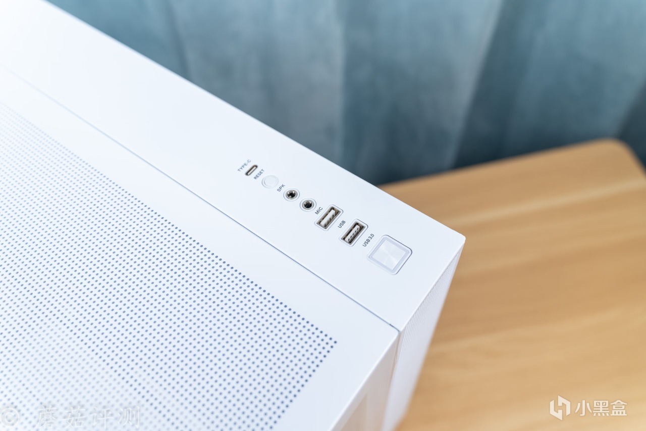 ▼机箱的IO面板在顶部的右上角,除了开机键和重启键之外,还有一个USB 2.0、一个USB 3.0、一个Type-C和两个3.5mm的音频接口。